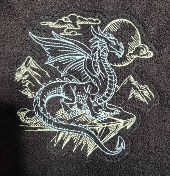 Bring a touch of magic and mystery into your world with the Embroidered Mystic Dragon sweatshirt. This enchanting design features intricate embroidery of a majestic dragon, showcasing stunning details that are sure to impress. To elevate this piece even further, glow-in-the-dark threads are used, making the dragon come alive at night with a breathtaking luminescent effect. This pattern is 7 1/2″ X 7 1/2″. The dragon is embroidered with a light blue glow in the dark thread and the mountains. sun, and clouds are embroidered using a light green glow in the dark thread on a black sweatshirt. Whether you’re a fan of mythical creatures or simply appreciate unique artworks, this embroidered creation is designed to captivate all eyes with its intricate patterns and embroidery finesse. Just hold the design to a light for a few minutes or stand close to a light source for a magical display. Please note, the dragon shown was embroidered on a fleece vest and has knockdown stitches behind the design. A sweatshirt would not have this pattern of stitches underneath.
