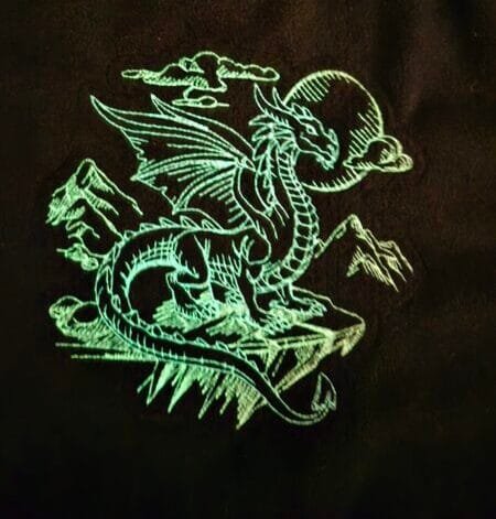 Mystic Dragon embroidered on a sweatshirt with glow in the dark threads