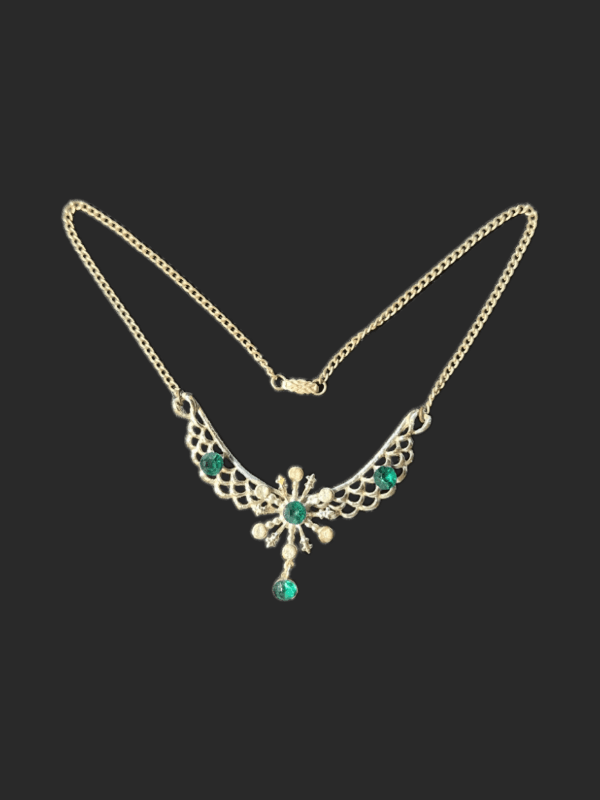 This vintage necklace features an ornate filigree pendant blending silver tones with warm gold accents for a dimensional, antique look. The pendant is set with rich emerald‑green glass stones that feel cool to the touch and show bright internal facets when viewed from above — a hallmark of mid‑century costume jewelry craftsmanship.