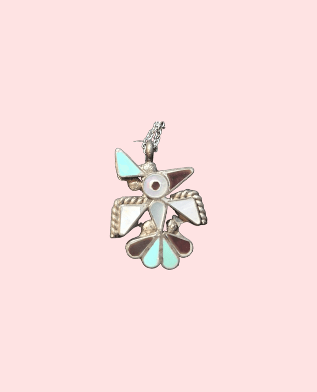 A vintage silver‑tone thunderbird pendant necklace featuring colorful inlay‑style accents in turquoise, white, and rust tones. Lightweight, bold, and full of retro Southwestern charm. Includes matching chain with a secure fold‑over clasp.