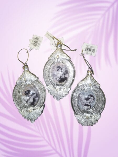 Imagine your Christmas tree adorned with ornaments that whisper tales of elegance and timeless beauty. This set of three, Visions of Beauty ornaments, are designed to do just that. More than just decorations, these ornaments are miniature works of art, ready to transform your holiday setting into a vision of festive splendor. Each ornament in the Visions of Beauty has a different nostalgic picture of a girl with a captivating design. Crafted with glimmering silver, that have a finish that catches the light, creating a mesmerizing play of shadows and sparkles. These ornaments are light weight and won’t weigh down your tree.